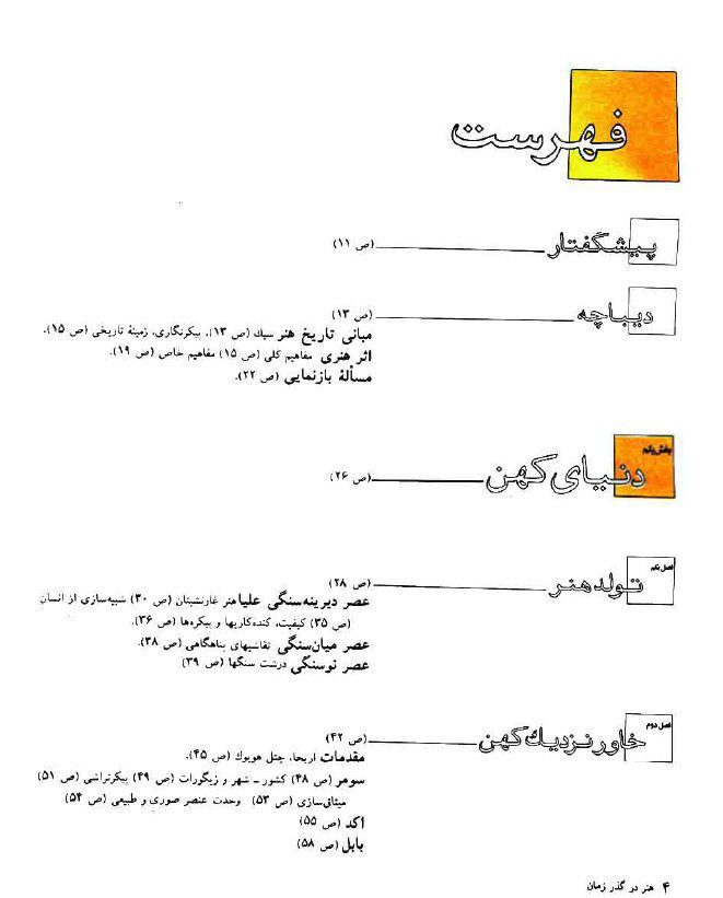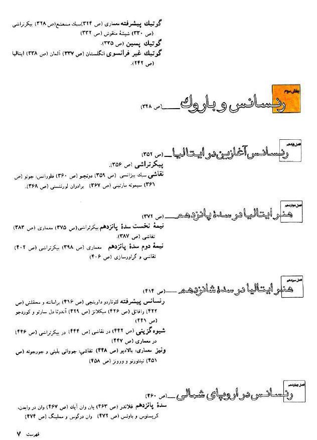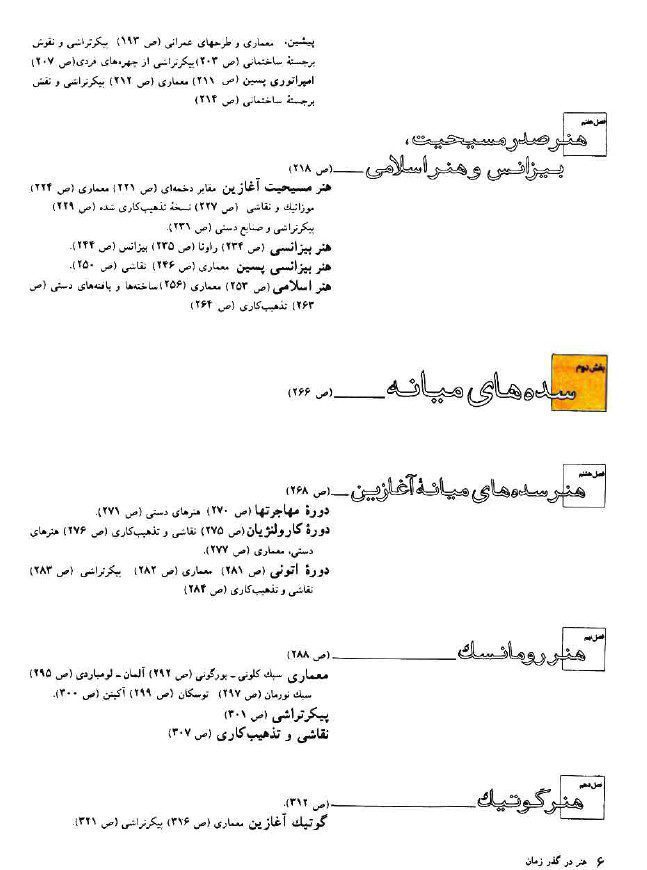- بخش سوم (قرون وسطی و شرق): هنر بیزانس، ظهور هنر اسلامی، مساجد، مینیاتور و تمدنهای هند و چین.