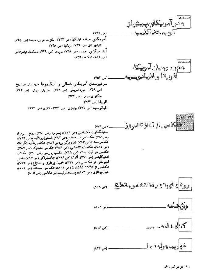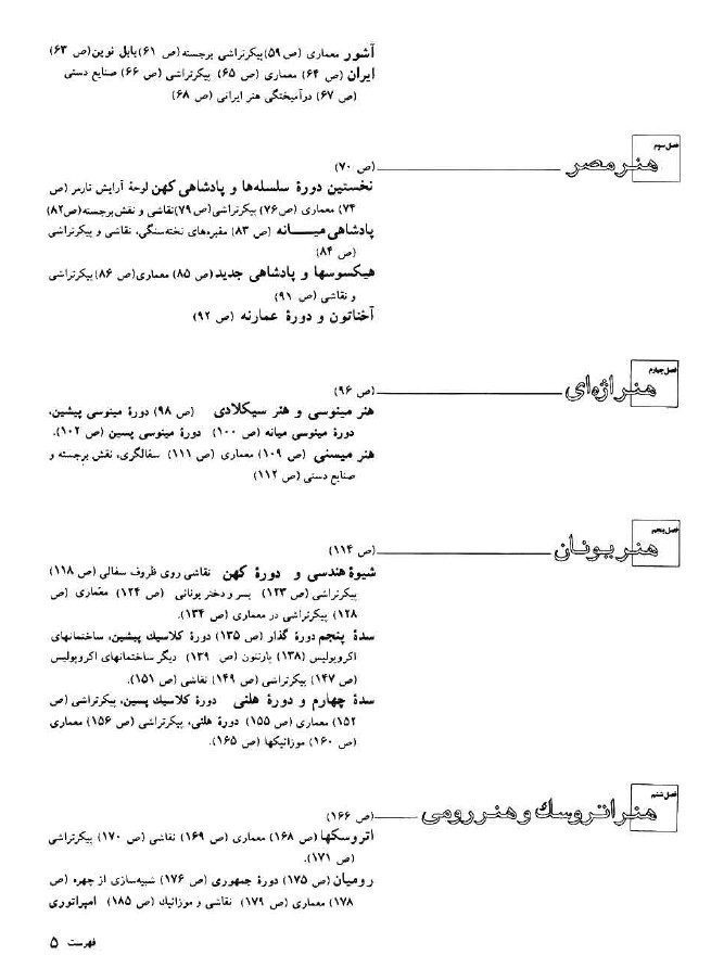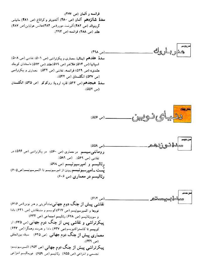 - بخش پنجم (عصر مدرن و معاصر): از امپرسیونیسم تا کوبیسم، مکتب باوهاوس، پستمدرنیسم و هنر دیجیتال قرن حاضر.