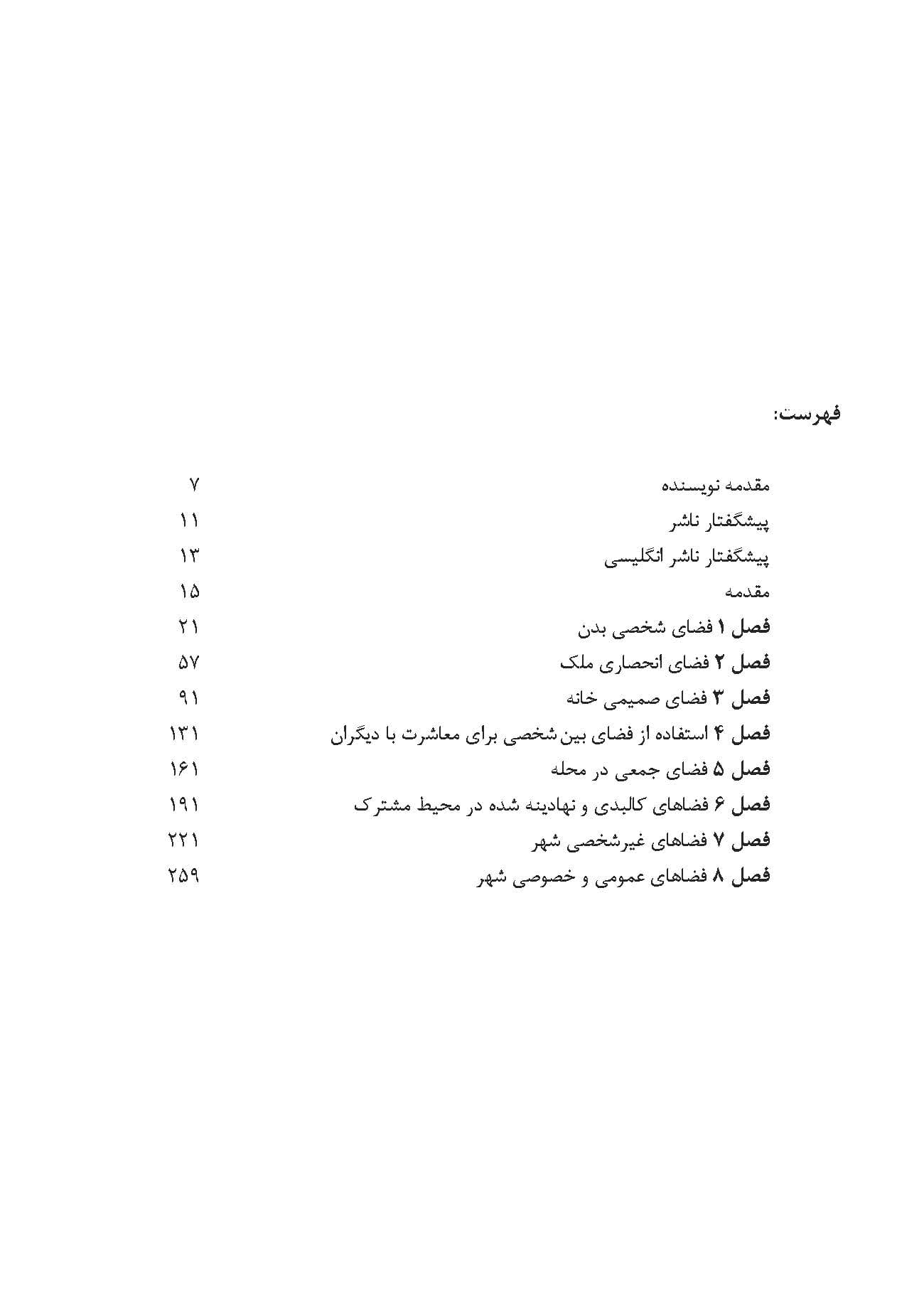 در بخشهای اصلی کتاب، تمرکز نویسنده بر تمایز و در عین حال پیوستگی فضاهای عمومی و خصوصی در شهر است.
