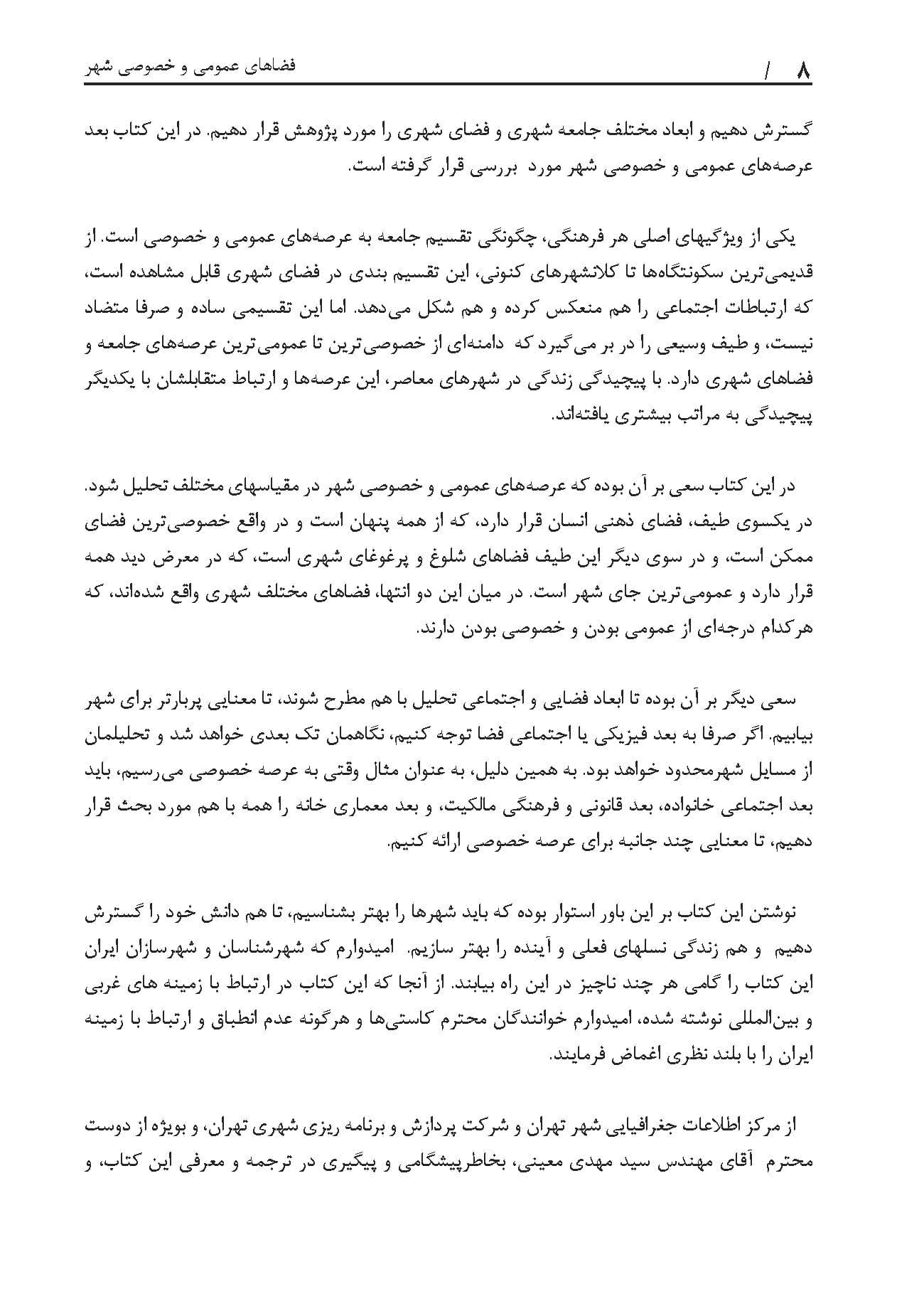 به تعبیر نویسنده، فضا در شهرهای معاصر نهفقط پسزمینهای برای فعالیتها، بلکه عنصری فعال و تأثیرگذار بر کیفیت زندگی شهری است.