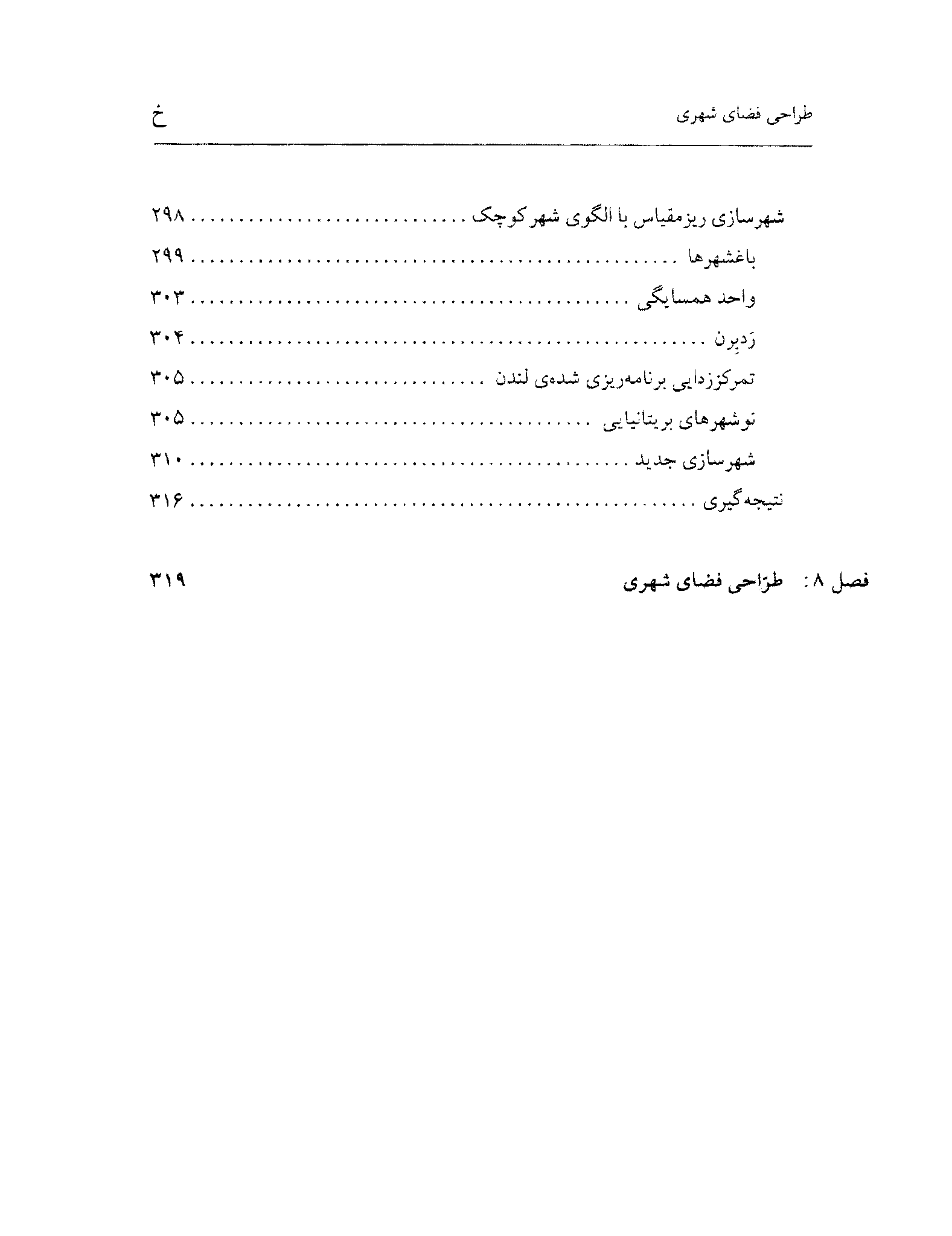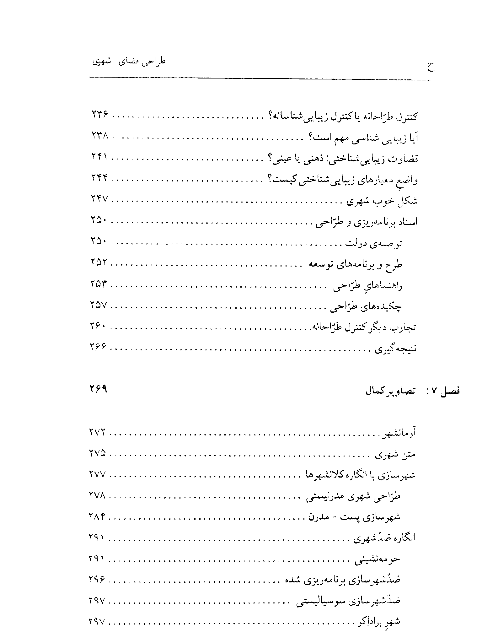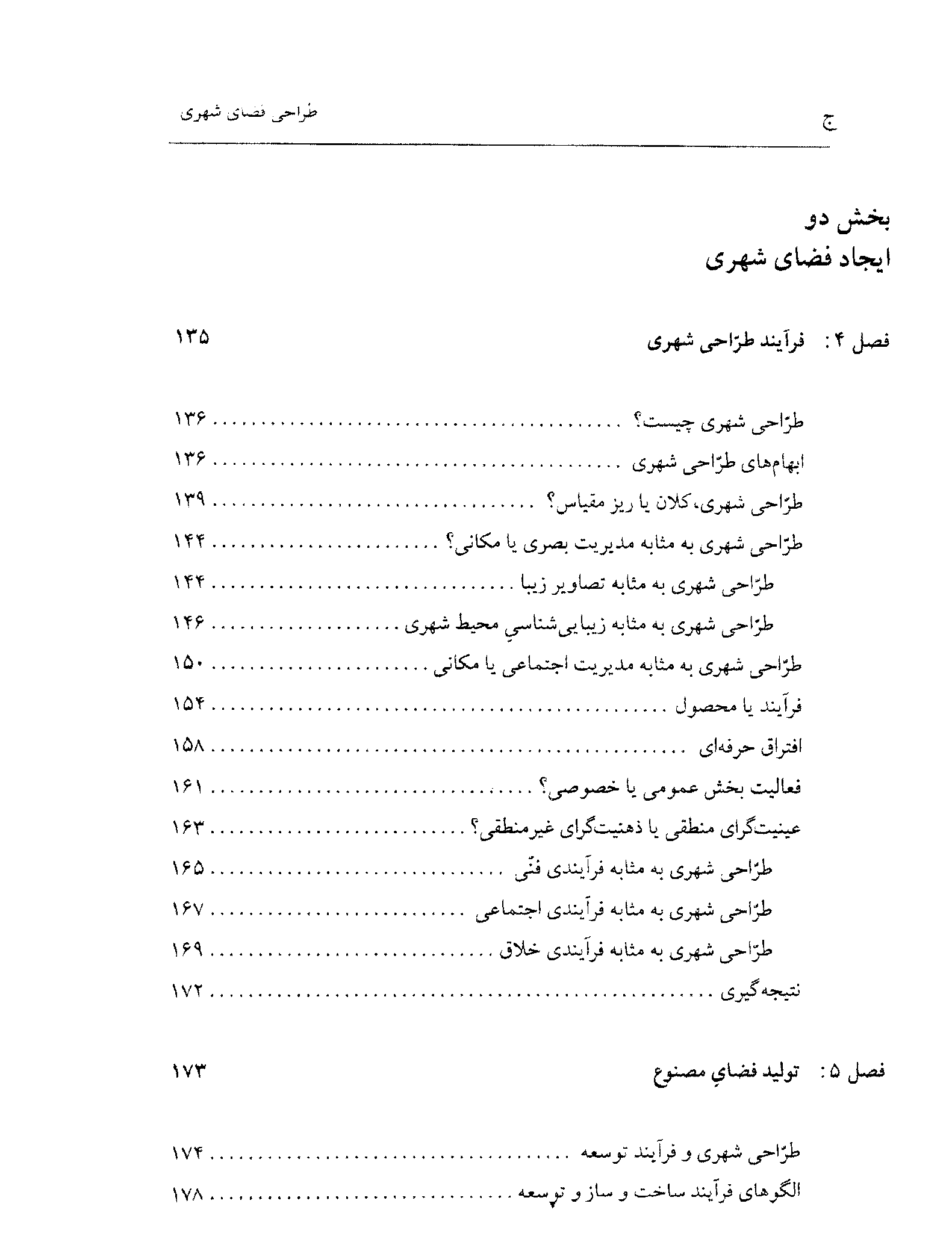 کتاب حاضر در دو بخش اصلی با عناوین “دیدگاههایی درباره فضای شهری” و “ایجاد فضای شهری” و هشت فصل تدوین شده است. در فصل اول با عنوان “درک فضای شهری”، مفاهیم فضا و رابطه آن با فضای شهری تبیین شده است. در فصل دوم چگونگی ساختاریابی فضای شهری مطرح میشود. فصل سوم به زندگی روزمره درشهر اختصاص یافته، طی آن، مطالبی در باب مردم درون ساختارهای شهری عنوان شده است. در فصل چهارم مخاطبان با تعاریف و فرآیندهای طراحی شهری آشنا میشوند. فصل پنجم به فرآیند تولید فضای مصنوع میپردازد. فصل ششم به ضابطهدار ساختن شکل شهر اختصاص دارد. فصل هفتم به تصاویر کمال میپردازد و در نهایت، فصل هشتم به طراحی فضای شهری میپردازد.