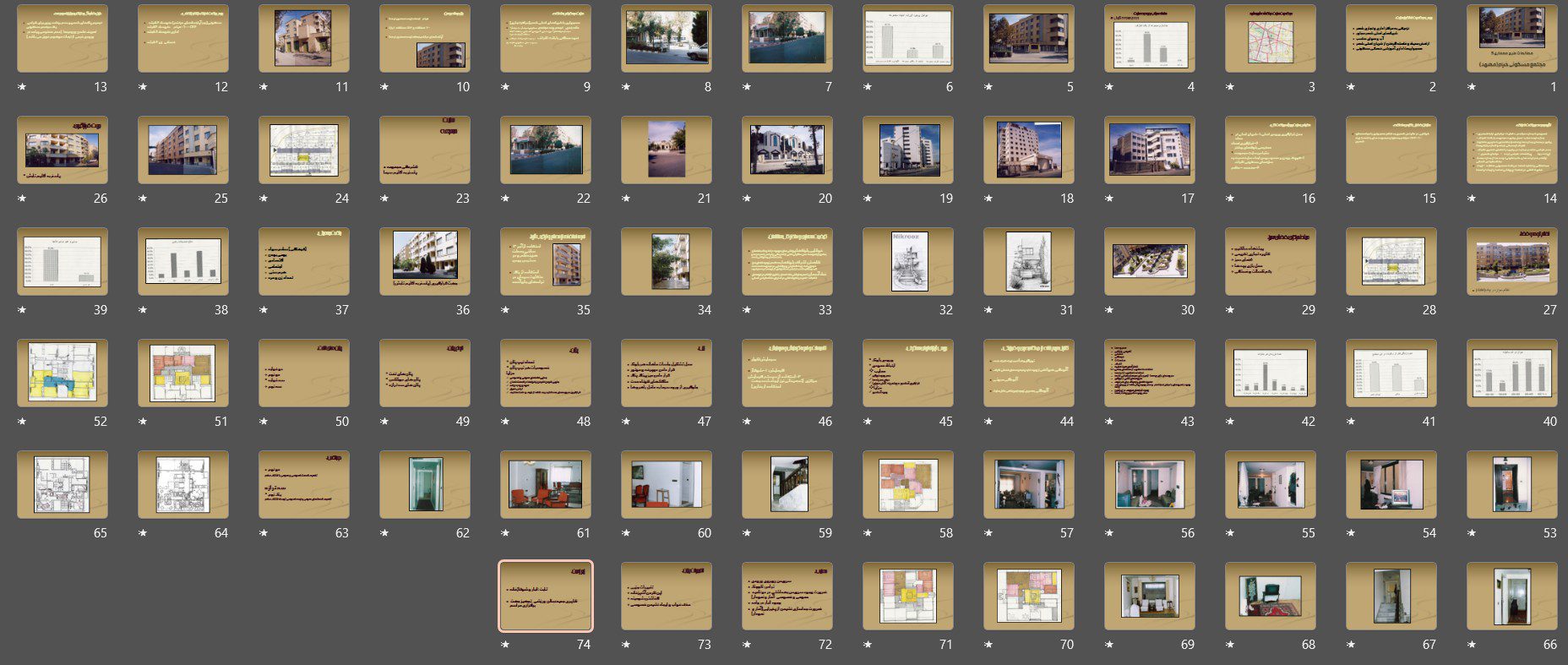 در بخشهای مختلف پاورپوینت، نقشهها، دیاگرامها و تحلیلهای موردنیاز برای شناخت بهتر پروژه ارائه شده و تلاش شده ارتباط بین ایده طراحی، کالبد معماری و نیازهای سکونتی بهصورت شفاف نمایش داده شود.