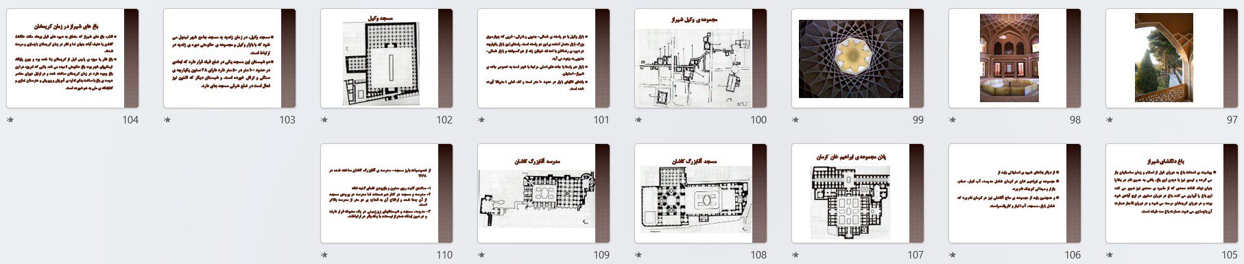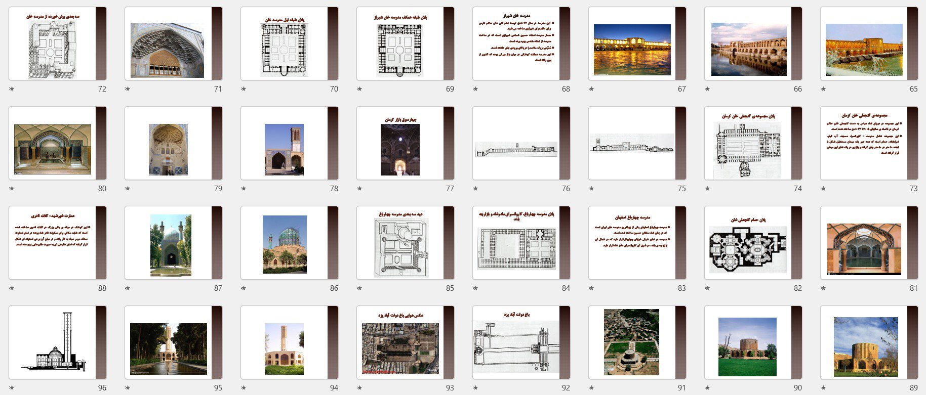 ساختار فایل بهگونهای طراحی شده که برای ارائه کلاسی، امتحان دروس معماری اسلامی، تاریخ معماری ایران و مطالعات تطبیقی سبکها کاملاً کاربردی باشد و نیاز دانشجو را به منبع مکمل تا حد زیادی برطرف کند.